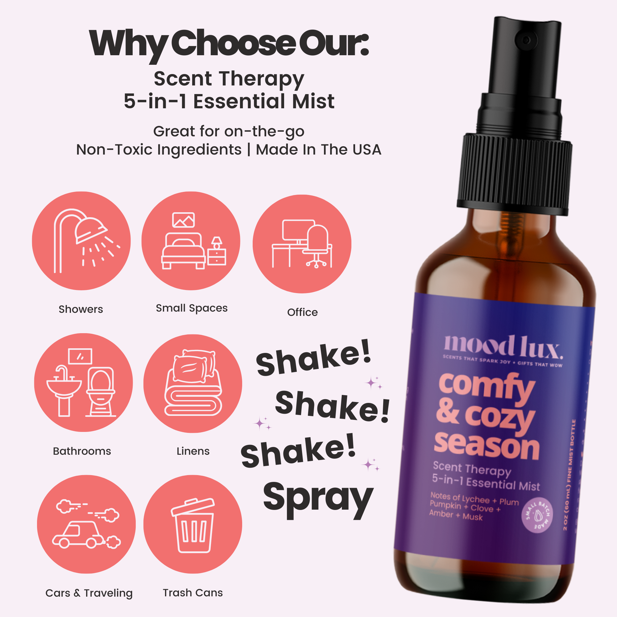 People love the many uses!! Comfy and Cozy Season Scent Therapy 5-in-1 Essential Mist can be used as a freshener for rooms, small spaces, showers, toilets, cars, and is the perfect travel buddy for gym bags, hotel stays, and a stuffy office.